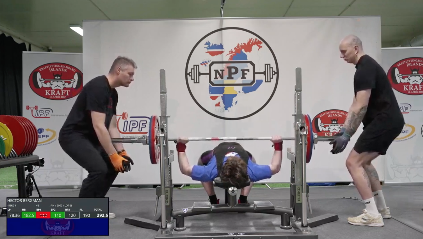 I bänkpress fanns det förhoppningar om att återigen göra rekord, och denna gång ett finländskt sådant! Han inledde med säkra lyft på 190 kg samt 205 kg för att sedan begära 215 kg vilket skulle innebära en höjning av U23-rekordet med 2 kg. Vikten var på god väg upp, men han orkade tyvärr inte trycka upp den hela vägen.