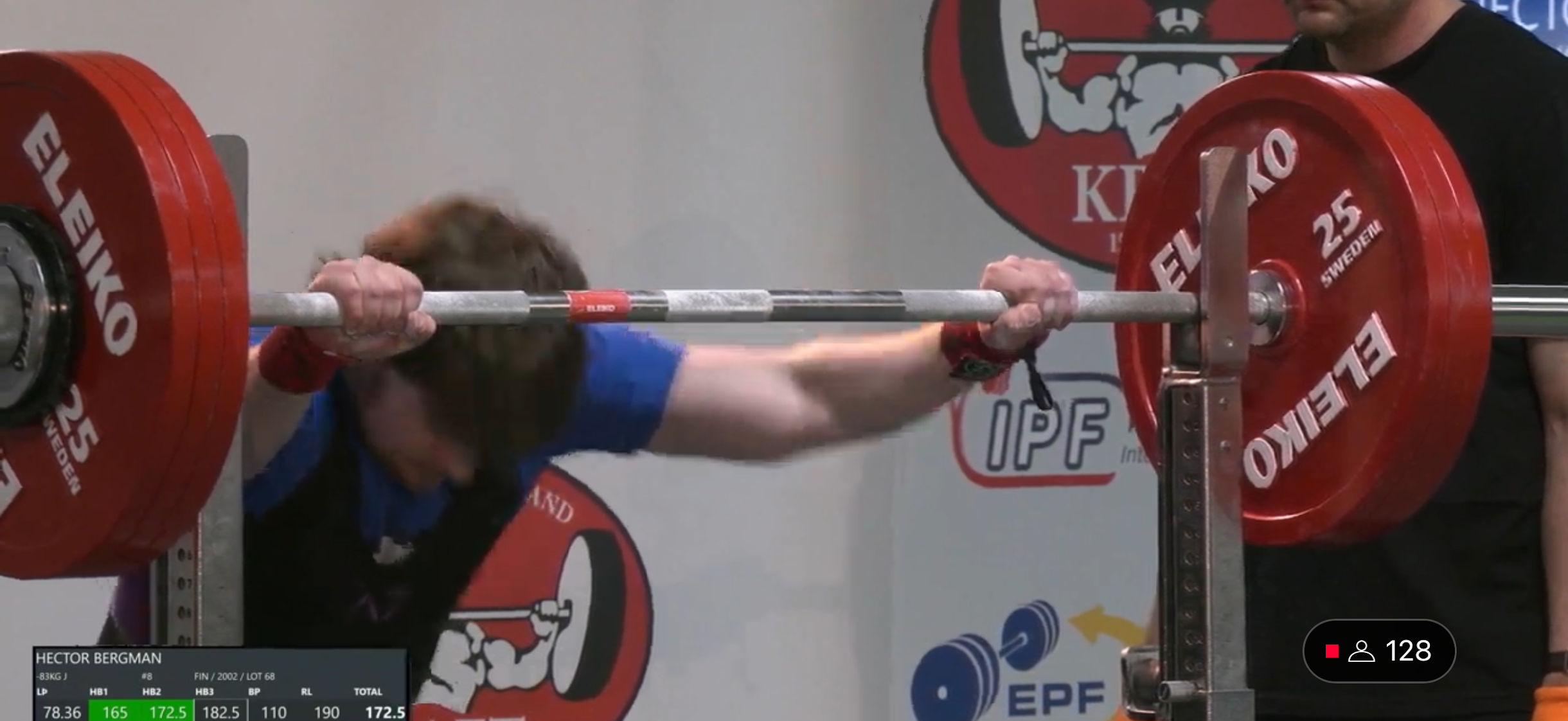 Hector Bergman tävlade i 83kg klassen där han satte serien 182,5kg i knäböj, 110kg i bänkpress, 212,5kg i marklyft och 505kg totalt vilket innebar en åttonde plats totalt.