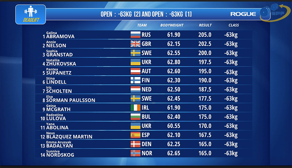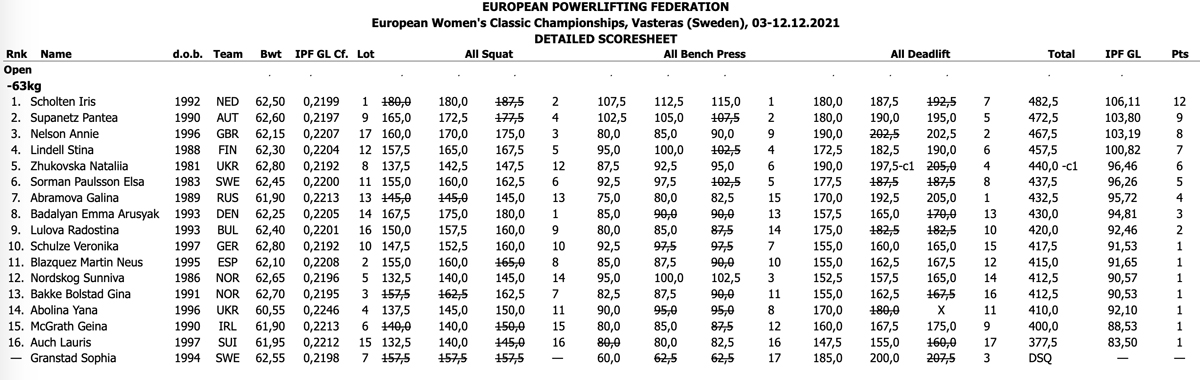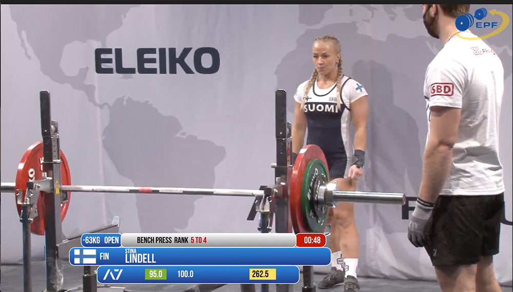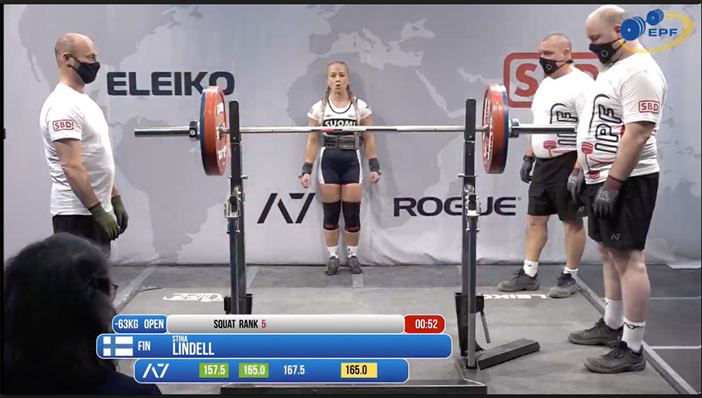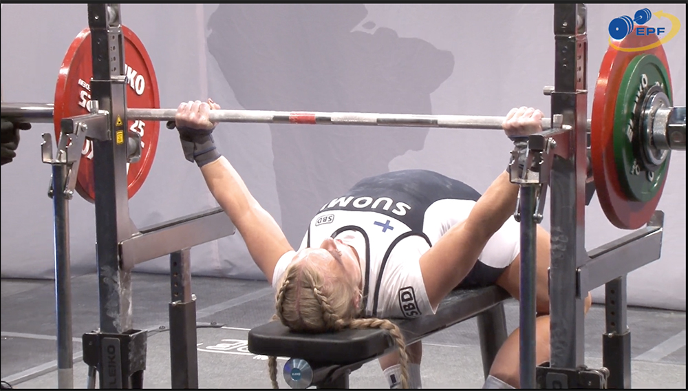 Hon vägde in på 62,3kg och fick till en riktigt bra inledning då hon säkert satte alla tre knäböj där sista lyftet på 167,5kg såg rätt bekvämt ut trotts att det var nytt personbästa på tävling med 7,5kg. 167,5kg räckte till en femteplats i knäböj och det är också nytt SFI-rekord, endast 1,5kg från det finska rekordet som ligger på 169kg.