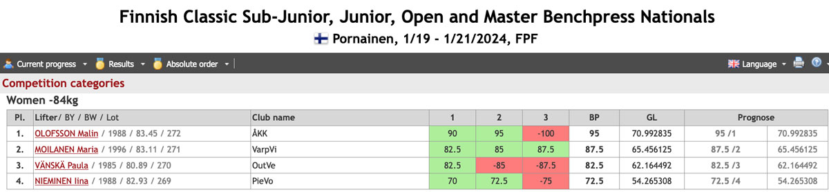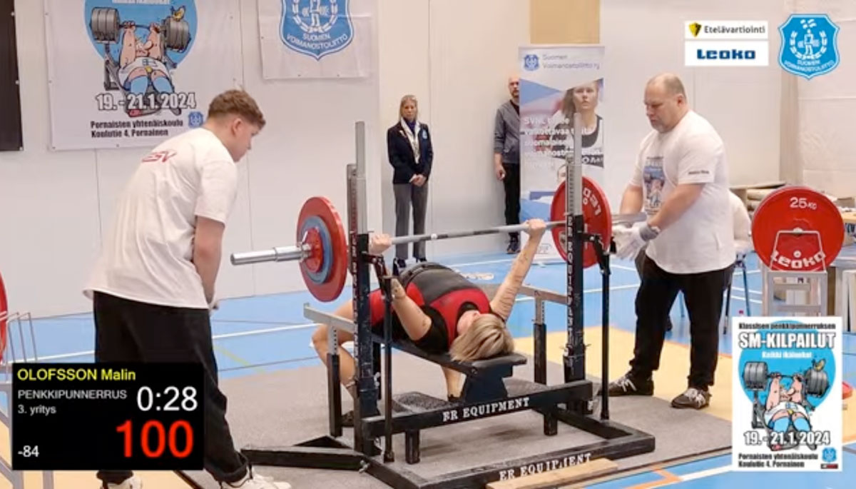 Malin Olofsson var ende ÅKK-lyftare på plats i Borgnäs då årets finska mästerskap i klassisk bänkpress avgjordes. Hon tävlade i 84kg klassen tillsammans med tre andra lyftare och redan i sitt första lyft på 90kg satte hon press på de andra som gick in på lättare vikter. Hon klarade ingången och ökade till 95kg i andra vilket hon också klarade utan problem. Ingen av de andra lyftarna hotade bakifrån och hon begärde upp 100kg för nytt personbästa till sista lyftet, men tyvärr orkade hon inte pressa den vikten hela vägen den här gången. 95kg gav ändå guldet i klassen, silver och brons gick på 87.5kg respektive 82,5kg.