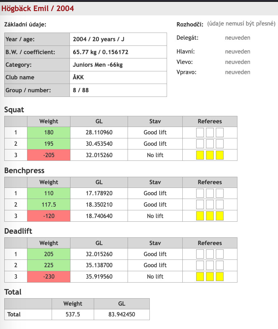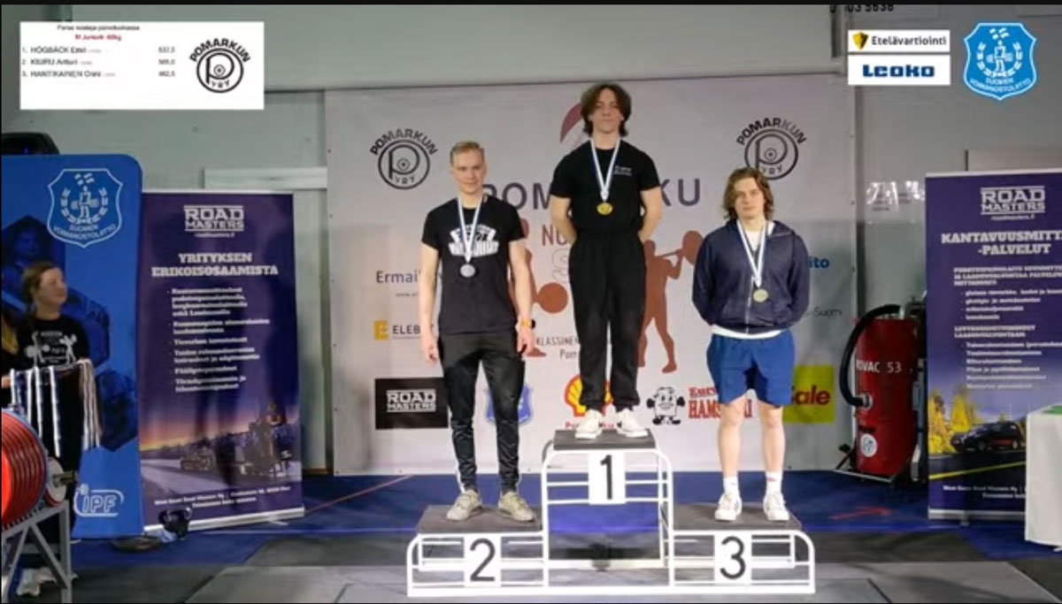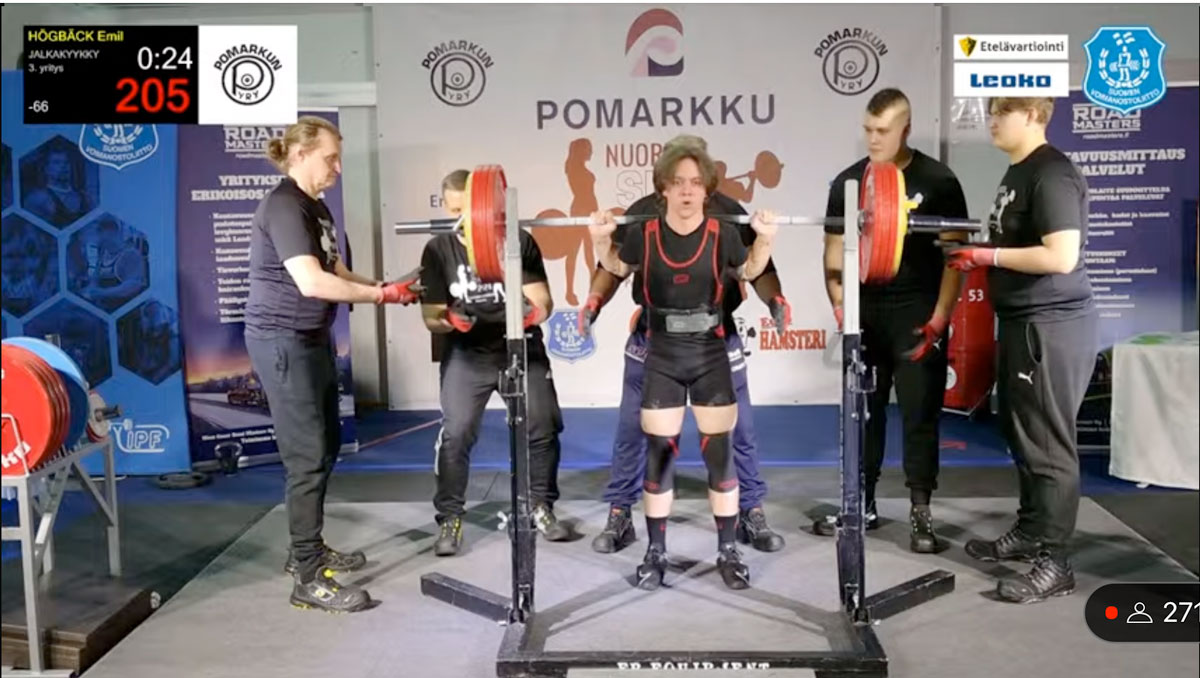 Emil Högbäck vägde efter lite småbantande in på 65,85kg i 66kg klassen U23. Han var ensam i klassen och fick med sig nytt personbästa och nytt SFI-rekord i knäböj med 195kg. I bänken blev det 115kg och i marken stannade han på 210kg från andra rundan efter att ha gjort ett försök på finländska rekordvikten 240,5kg i sista, det blev dock för tungt den här gången. Totalt fick han ihop 520kg vilket också innebar att han blev dagens bäste juniorlyftare på poäng (hur mycket man lyfter i förhållande till kroppsvikt).