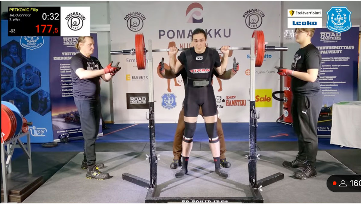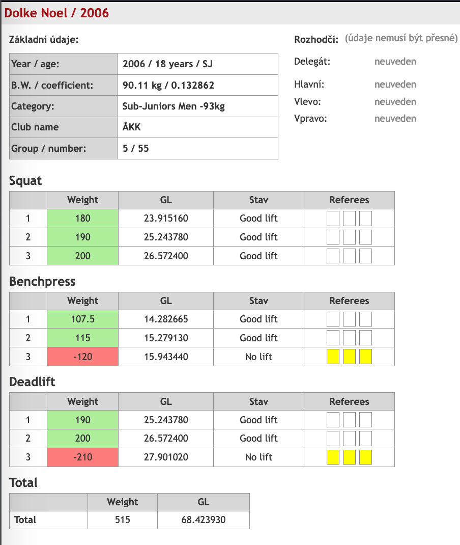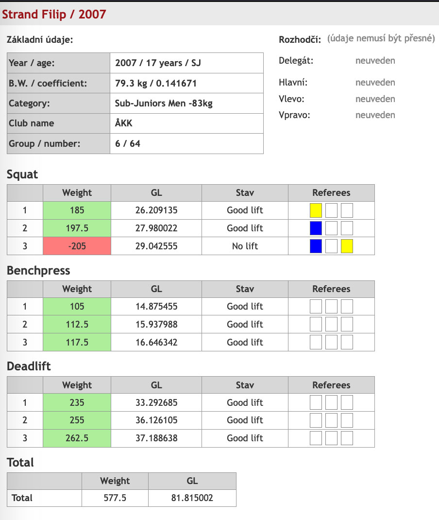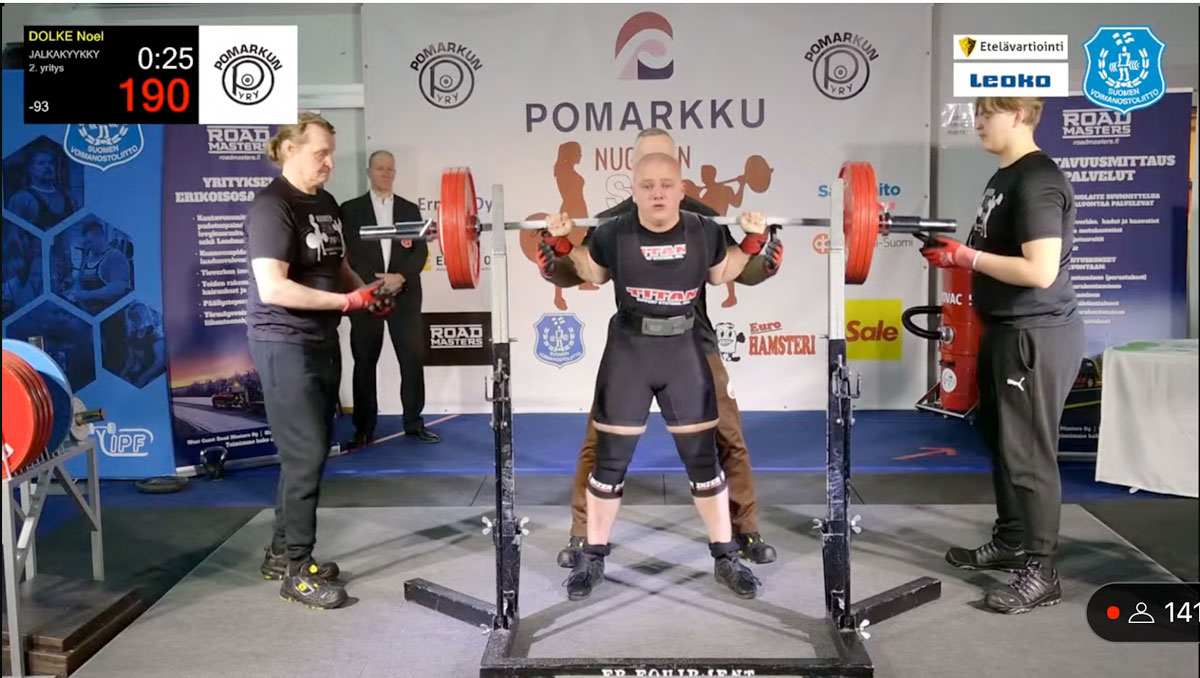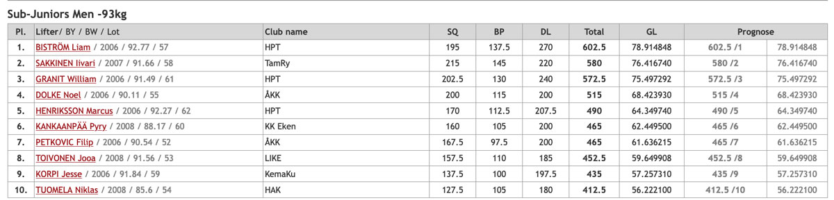 I 93an kom tolv lyftare till start och både Kasimir och Lucas fick till bra tävlingar. Kasimir satte nytt personbästa och nytt åländskt rekord med 227,5kg i andra rundan och försökte sedan på 235kg i sista men det blev för tungt för dagen. I bänken fick han med sej alla tre lyft med 160kg i sista, också det nytt personbästa, och i marken blev det två godkända med 260kg som bäst efter bom på 270kg i sista. Totalt gav det nytt personbästa och nytt åländskt rekord på 647,5kg och en sjätte plats i tävlingen. Lucas satte nya personbästan i både knäböj, marklyft och totalt efter serien 167,5kg i knäböj, 122,5kg i bänkpress, 200kg i marklyft och 490kg totalt vilket gav en tolfte plats. Guld, silver och brons gick på 810,5kg, 715kg och 710kg.