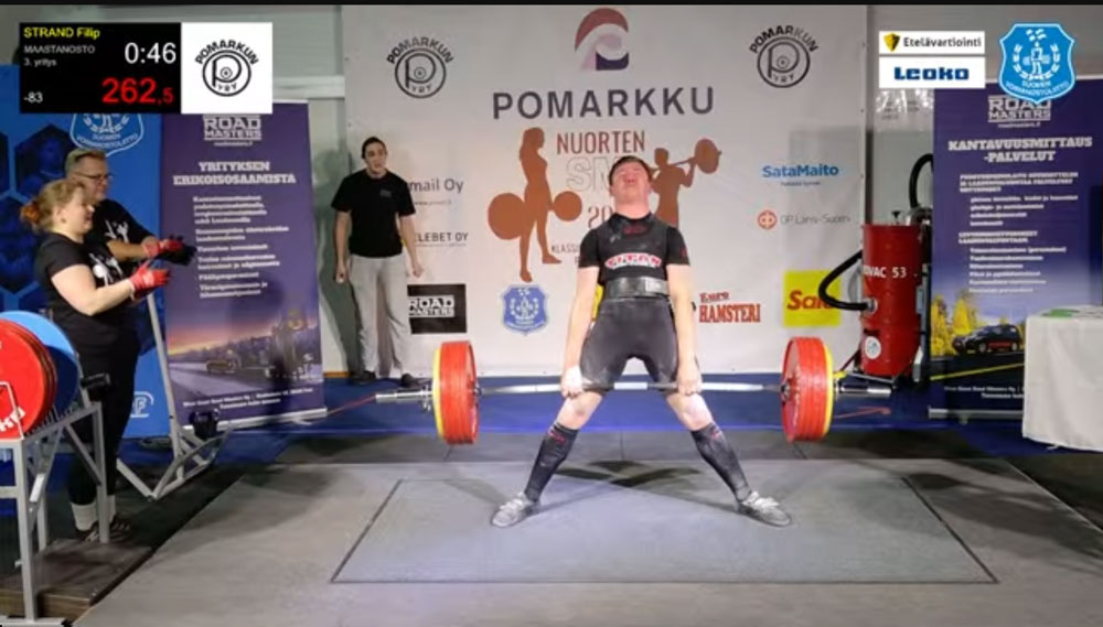 Totalt tretton lyftare tävlade i 83kg klassen, Filip S. fick med sig två böjar med 197,5kg som bäst från andra rundan, han fick också upp 205kg i sista lyftet men det underkändes med 2-1 av domarna. I både bänken och marken fick han alla tre lyft med 117,5kg och 262,5kg och han slutade på en fin andra plats med 577,5kg totalt. Guldet gick på 630kg och bronset också det på 577,5kg men med tyngre kroppsvikt än Filip S. Bänk, mark och totalen var nya personbästan och marken är nytt SFI-rekord. Han slutade också fyra på poäng bland alla U18 killar vilket mycket väl kan inebära att han kan vara aktuell för en landslagsplats senare under året.