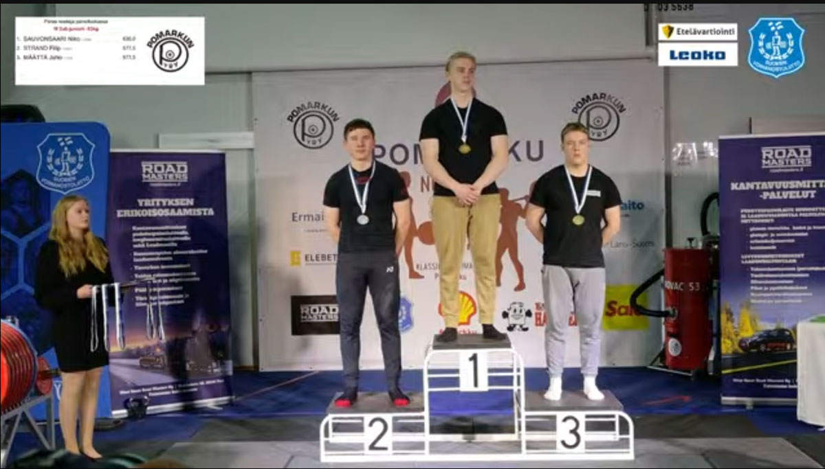 I bänken visste vi att han kunde vara med och slåss om medaljerna och han fick till det bra och satte alla sina tre lyft med 160kg lastat i sista vilket innebar delgrensguld, personbästa och nytt åländskt junior-rekord.