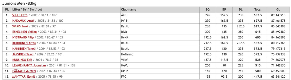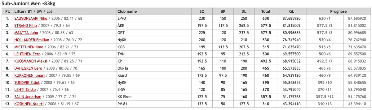 Noel och Filip P. var först ut i startfältet då 93an avgjordes före 83an, tio lyftare fanns med i klassen. För båda var det endast deras andra tävling men de lyckades ändå båda putsa sina personbästan i samtliga moment. Noel fick med sig alla tre böjar med 200kg i sista vilket är nytt åländskt rekord. I bänken slutade han på 115kg efter en bom på 120kg i sista. Marken slutade också på 200kg efter bom på 210kg i sista och han stannade på 515kg total vilket gav en fjärde plats. Filip satte 167,5kg i första knäböjen, höjde till 177,5kg i andra vilket han fick upp hela vägen men tyvärr underkänt. Han försökte igen i sista men då orkade han inte hela vägen upp. I bänken blev det 97,5kg i andra men bom på 105kg i sista. I marken drog han alla tre lyft med 200kg som bäst vilket innebar 465kg totalt. Guldet gick på 602,5kg, silver på 580kg och brons på 572,5kg. Guld och brons gick till Hangös Liam Biström och William Granit.