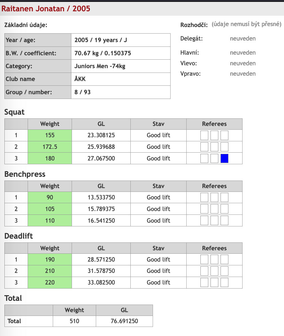 Emil som i vanliga fall brukar tävla i 66kg klassen vägde på spontaninvägningen in på 69,4kg och tävade därmed i 74kg klassen U23 där han inledde med att plocka det åländska rekordet i knäböj då han klarade 202,5kg i sitt andra lyft, han stod sedan över sista böjen. I bänken blev det ett lyft på 110kg och i marken blev det två lyft med 210kg som bäst och han slutade därmed på 522,5kg. Strongt av Emil att visa att man kan vara lite spontan i sitt tävlande och alla tävlingar ger någon erfarenhet som man kan ta med sej i framtiden.