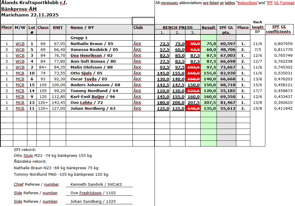 Detta var årets sista tävling. 10.1 är nästa tillfälle att ta sikte på då det är klubbtävling i styrkelyft. Grattis till alla åländska mästare och stort tack till alla passare, domare och sekretariatet, utan er ingen tävling.